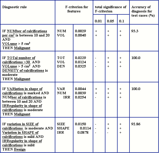 Regularities discovering in breast cancer diagnosis.Examples of extracted diagnostic rules.