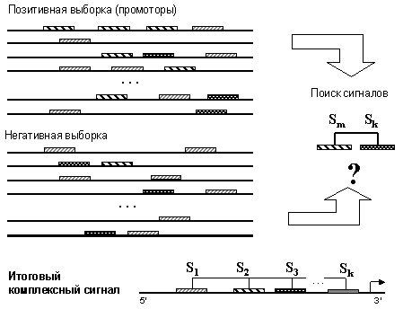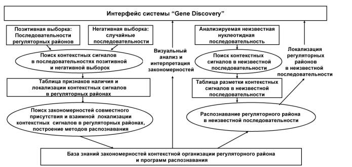 Система "Gene Discovery" включает в себя модуль поиска закономерностей в таблицах молекулярно-биологических баз данных, статистически значимо коррелированных с классом регуляторных последовательностей и модуль распознавания промоторов в нуклеотидной последовательности на основе отобранных закономерностей (Витяев и др., 2001). Принципиальная схема системы представлена на рисунке 2.6.