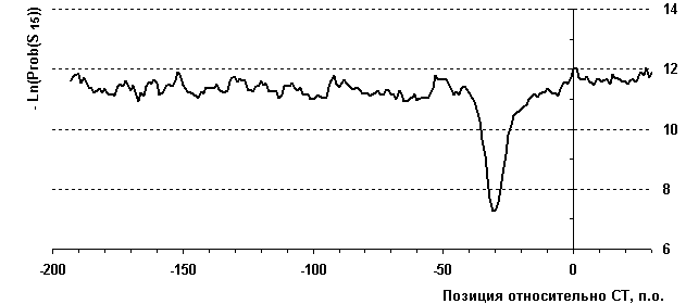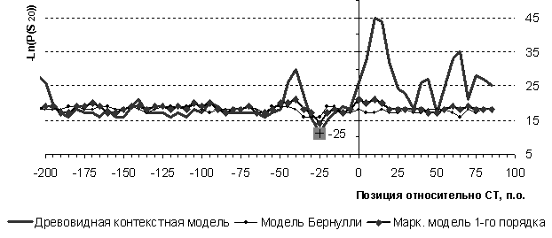 По выборке нуклеотидных последовательностей TATA-боксов была построена древовидно-контекстная модель (марковская модель с переменной памятью). Затем анализировались последовательности промоторов из базы данных TRRD. В скользящем окне 20 п.о. рассчитывались вероятность получения данного участка, и строился профиль логарифма такой вероятности, взятого со знаком минус. Минимальному значению профиля (-25 п.о. относительно старта транскрипции) соответствует участок, наиболее характерный для модели TATA-боксов (Рис. 3.1.6).