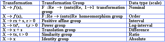 DATA TYPESProblem of data typesThe design of a particular data mining system implies the selection of the set of data types supported by that system. In Object-Oriented Programming (OOP), this is a part of the software design. Data types are declared in the process of software development. If data types of a particular learning problem are out of the range of the data mining system, users have two options: to redesign a system or to corrupt types of input training data for the system. The first option often does not exist at all, but the second produces an inappropriate result. There are two solutions for this problem. The first is to develop data type conversion mechanisms which may work correctly within a data mining tool with a limited number of data types. For example, if input data are of a cyclical data type [Krantz et al, 1970, 1981, 1990; Kovalerchuk, 1973] and only linear data types are supported by the DM tool, one may develop a coding of the cyclical data such that a linear mechanism will process the data correctly. Another solution would be to develop universal DM tools to handle any data type. In this case, member functions of a data type should be input information along with the data (MMDR implements this approach). This problem is more general than the problem of a specific DM tool. Difficulties arise from the uncertainty of the set of interpretable operations and predicates for these data, i.e., uncertainty of empirical contents of data. The precise definition of empirical content of data will be given in terms of the empirical axiomatic theory below. Numerical data typeIn previous sections, the term numerical data was used without formal definition. Actually, there are several different numerical data types. The strongest one is called absolute data type (absolute scale). Having this data type in background knowledge B of a learning problem, we can use most of the known numerical relations and operations for discovering a rule. The weakest numerical data type is nominal data type (nominal scale). This data type is the same as the equivalence data type defined in Section 4.9.1. It allows us only one interpretable relation Q(x,y). In other words, it is known if x and y are equal. In between there is a spectrum of data types allowing one to compare values with ordering relations, to add, multiply, divide values and so on. Stevens [1946] suggested classification of these data types. They are presented in Table. The basis of this classification is a transformation group. The strongest absolute data type does not permit to transform data at all, and the weakest nominal data type permits any one-to-one transformation. This data type permits one-to-one coding of data entities by numbers. Intermediate data types permit different transformations such as positive monotone, linear and others (see Table 4.26) [Krantz, et al, 1990]. Numerical data types (Stevens’ classification of scale types)
